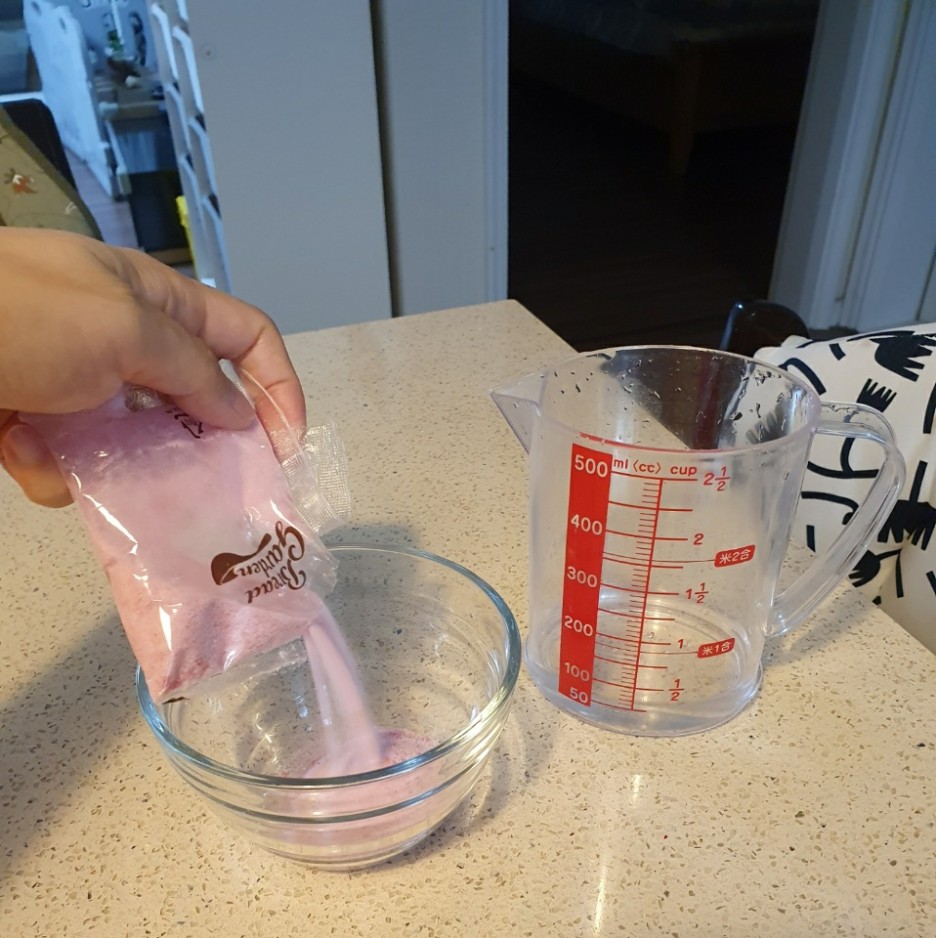 우선 빈 그릇에 젤리 가루를 붓고,