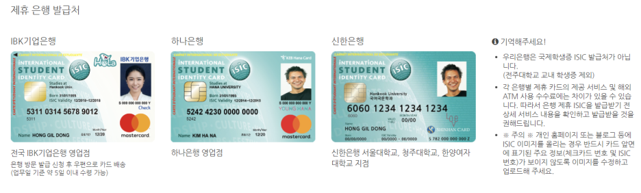 ISIC를 체크카드로 만들려면 아래 제휴 은행으로 신청서를 가지고 방문하시면 돼요.