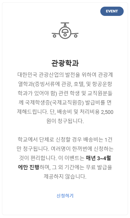 참고로, 관광학과 학생의 경우 매년 3~4월에 무료로 발급해주고 있어요.