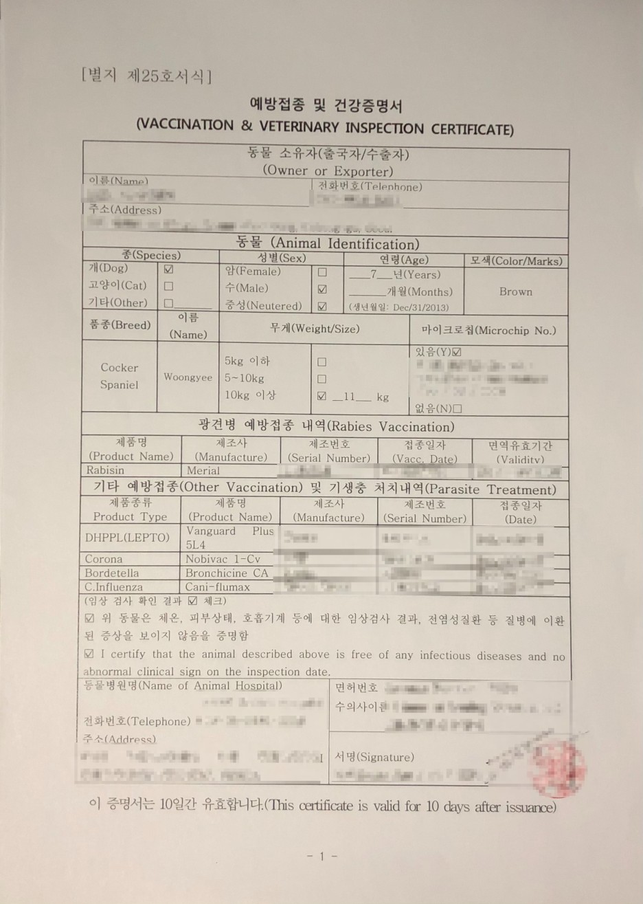 검역소에 함께 가서 예방접종 및 건강증명서를 발급받고