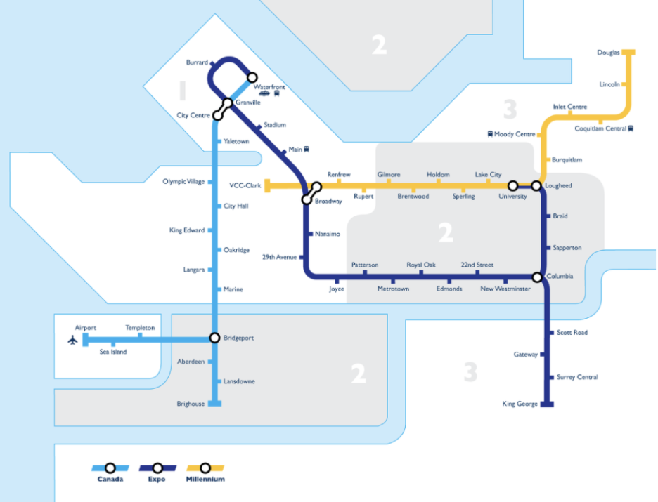 캐나다라인 (하늘색, 다운타운 ~ 리치몬드 / 다운타운 ~ 밴쿠버국제공항)