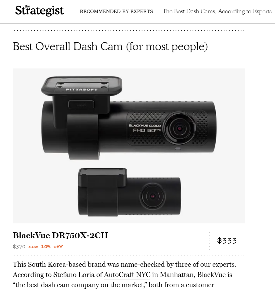 뉴욕매거진이라는 매체에 실린 탑 9 대시캠 기사의 1위 BlackVue도