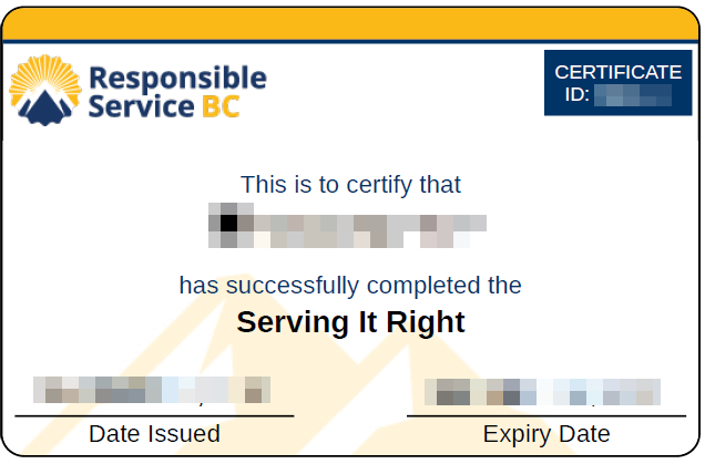 Serving It Right certificate number and expiry date.