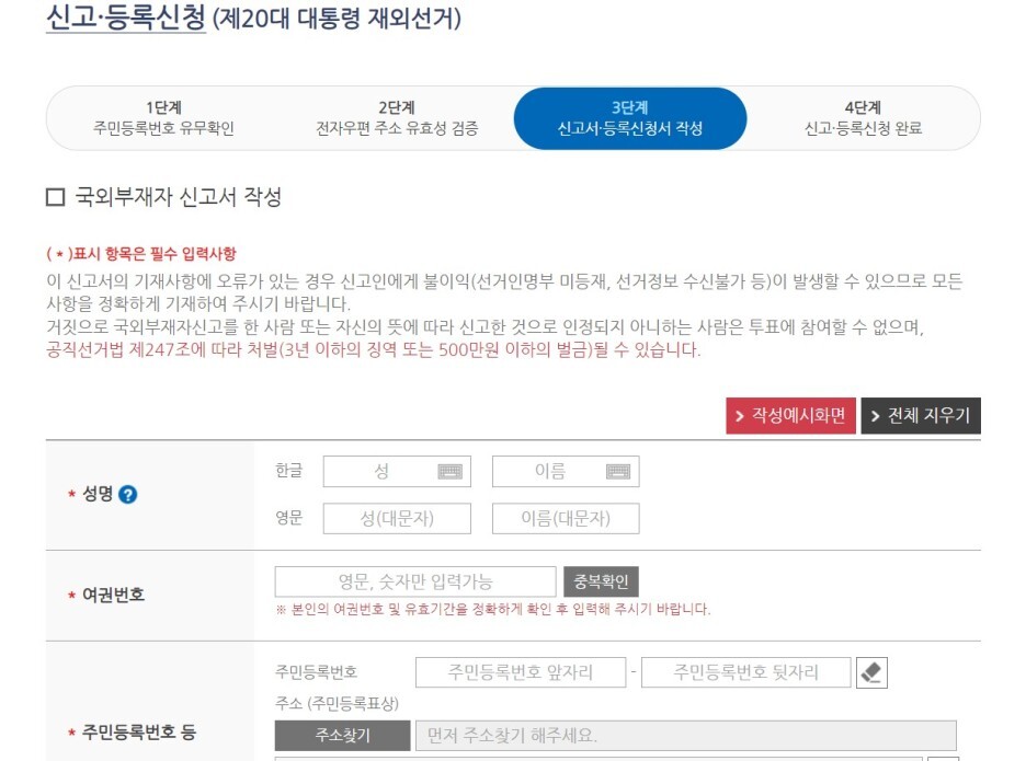 해외에서 체류, 거주중인 사람들은 국외부재자 / 재외선거인으로 사전 신고를 해서