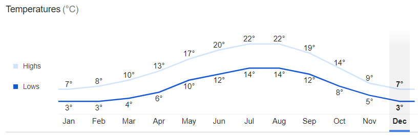겨울에는 습하고 약간 쌀쌀한 날씨와 비의 연속이에요.