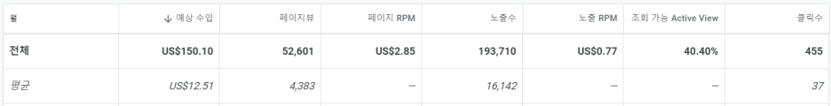 평균 방문자수는 비슷했는데 1년 수익은 63,043원 VS $150.10 (약 15만원) 이네요.
