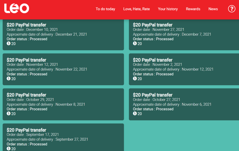 LEO는 20,000 포인트부터 $20씩 페이팔로 현금 전환이 가능했어서,