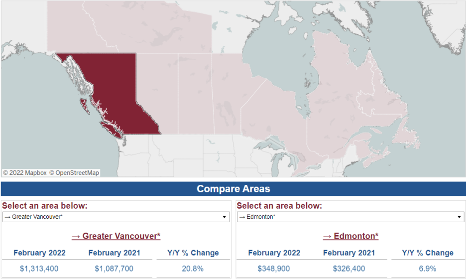 예로, 광역밴쿠버의 집값과 에드먼튼을 비교해 보면 그 차이가 얼마나 큰 지 알 수 있어요.