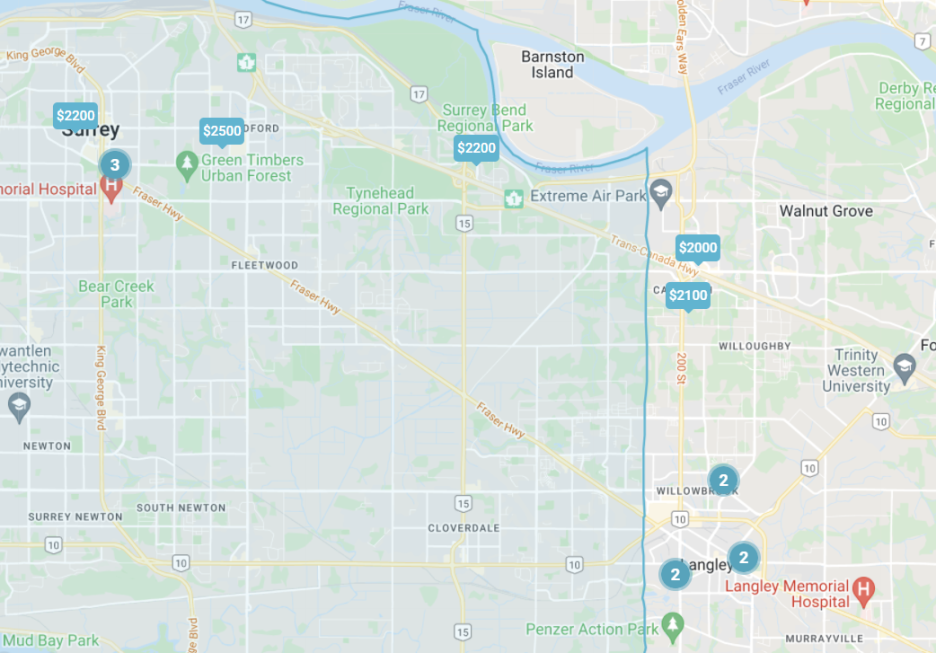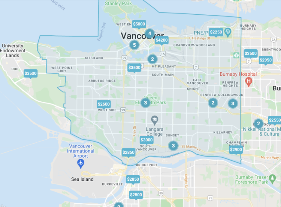 위에 지도처럼 밴쿠버에서는 약 3,000달러 (약 280만원) 정도의 월세에요.
