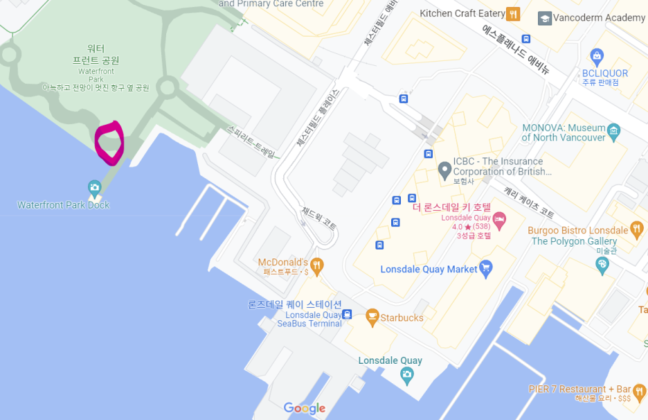 다운타운에서 씨버스를 타고 건너가는 노스 밴쿠버 론즈데일 퀘이 스테이션 왼쪽 워터프론트 공원이에요.