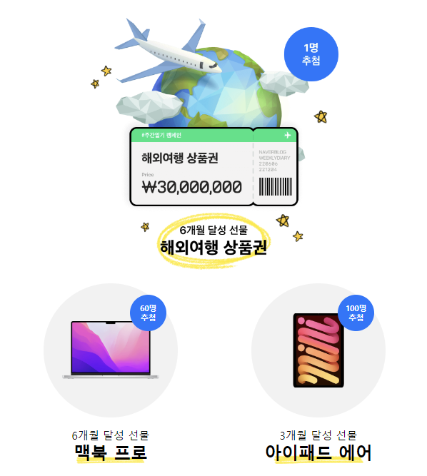 3개월 달성 아이패드 에어, 6개월 달성 맥북 프로랑 해외여행 상품권이 걸려있어요!