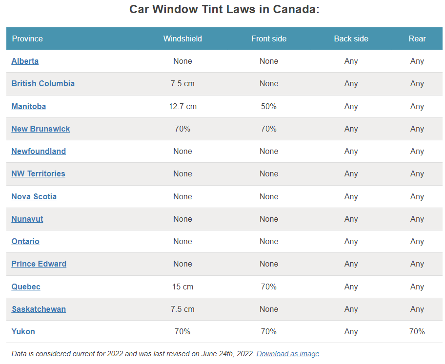 우선 캐나다의 각 주별 자동차 윈도우 틴팅에 대한 법 기준은 아래와 같아요.