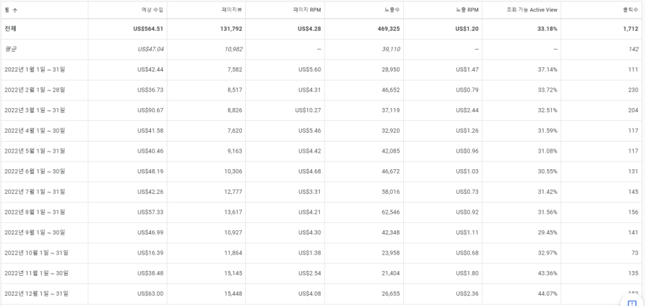 애드센스로 일년 동안 벌어들인 광고 수익은 $564.51 이에요.