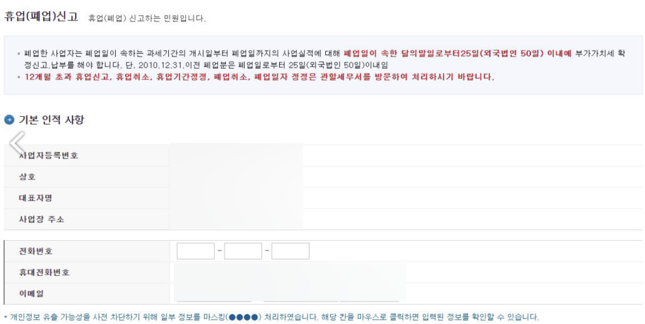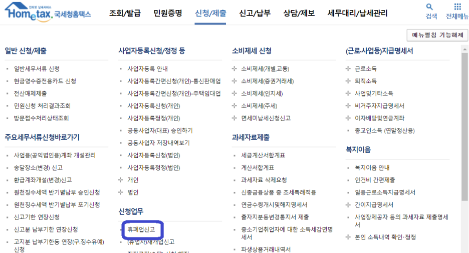 신청/제출 > 신청업무 아래 "휴페업신고"로 들어가세요.