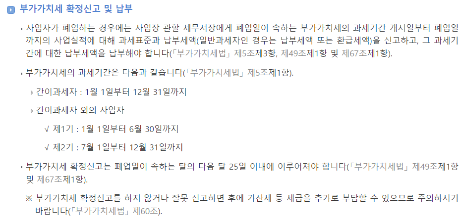 폐업신고 후 다음달 25일까지 부가세신고를 마쳐야해요.