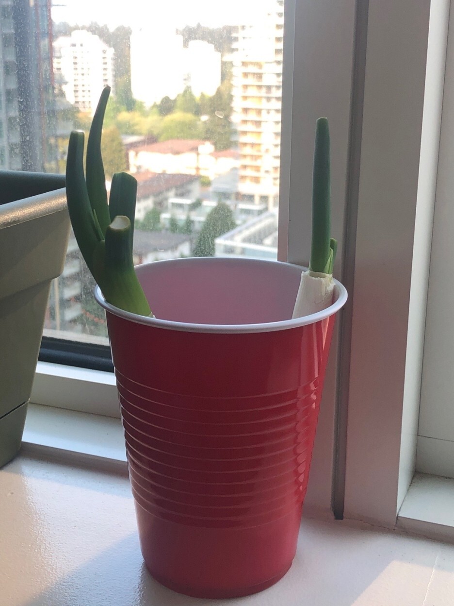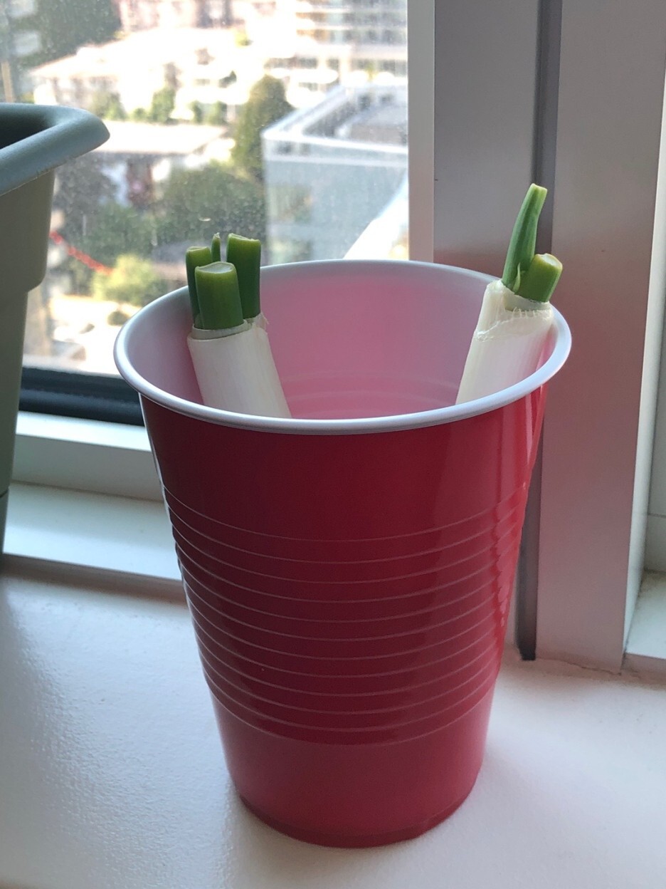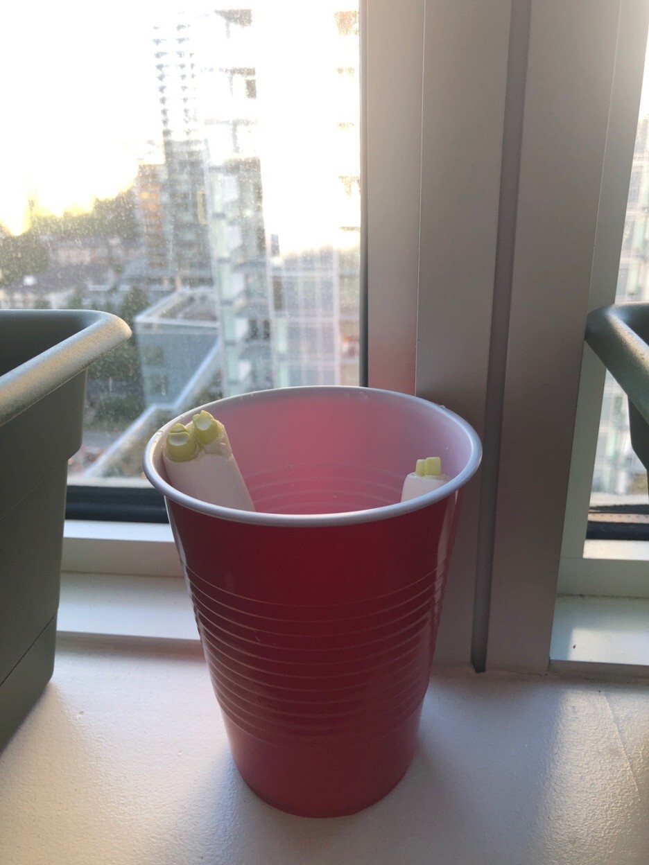 시장에서 파를 사다가 윗부분을 잘라서 요리에 쓰고 남은 밑둥을