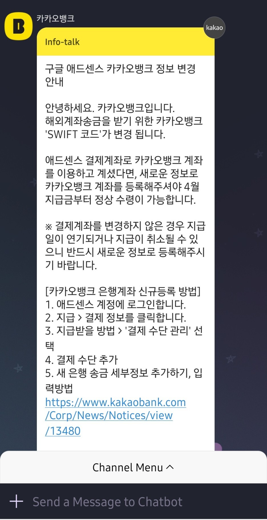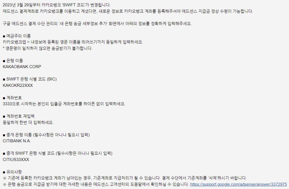 구글 애드센스의 입금 계좌로 혹시나 카카오뱅크를 사용하고 계시다면