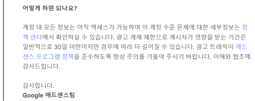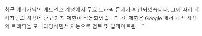 내용인즉, 제 티스토리에 연동된 구글 광고 게재가 제한된다는 메일이었어요.