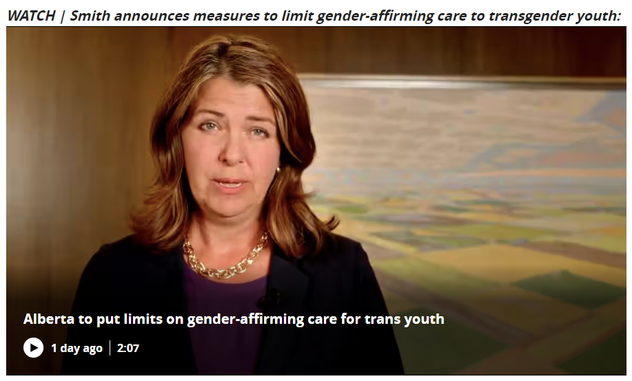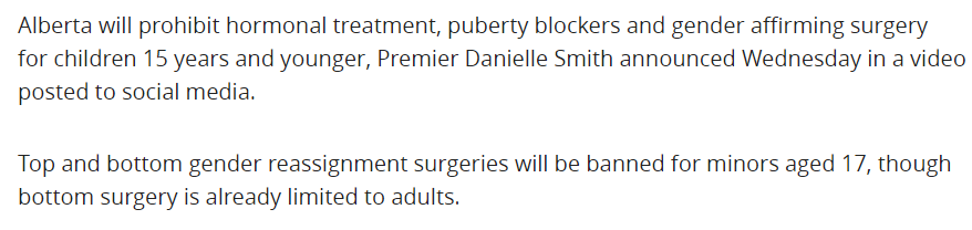 Alberta will prohibit hormonal treatment, puberty blockers and gender affirming surgery for children 15 years and younger.